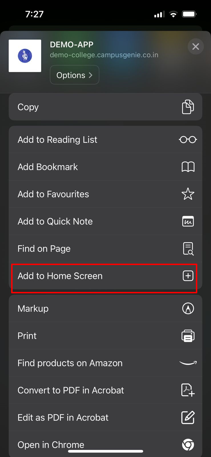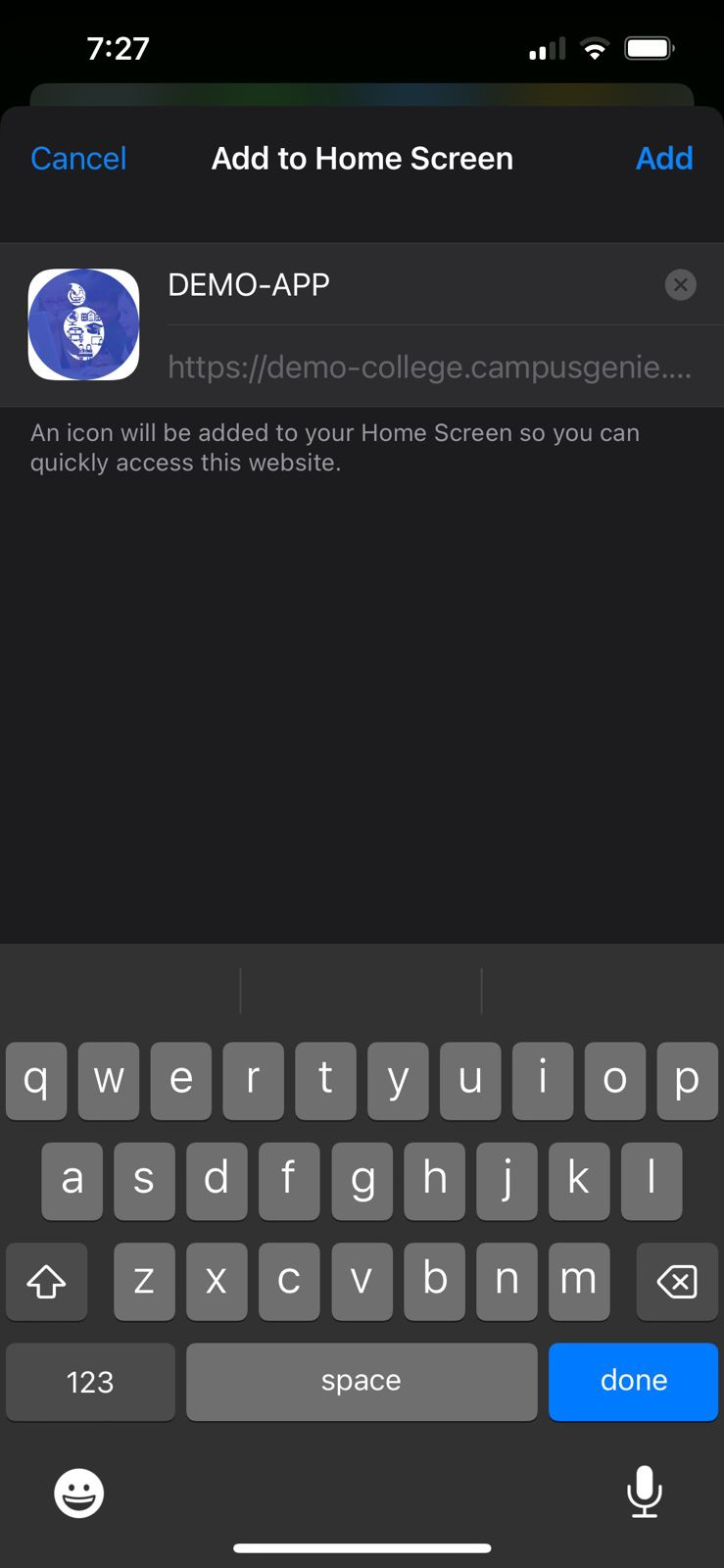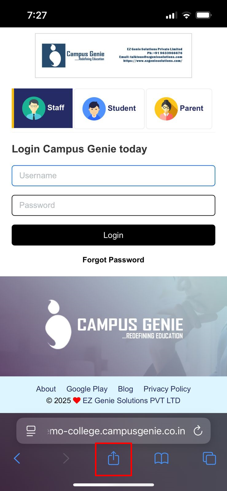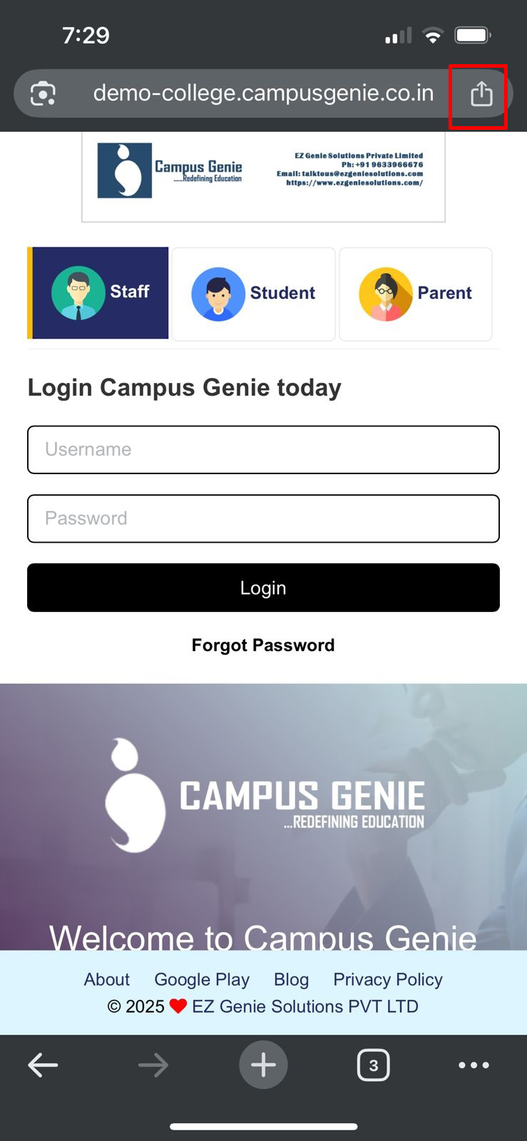 Safari browser on your mobile and type your campus url (https://snmc.campusgenie.co.in) in the search bar, and click on the share icon